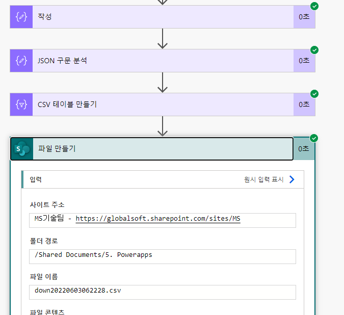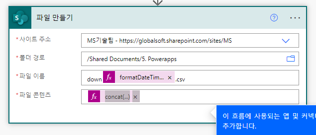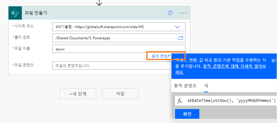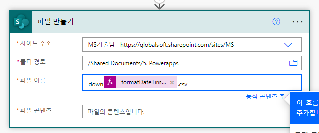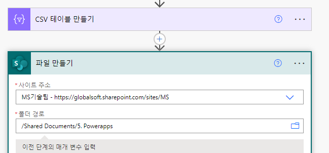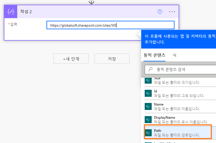새 단계 - 데이터 작업 - 작성 - Sharepoint URL 및 경로 설정