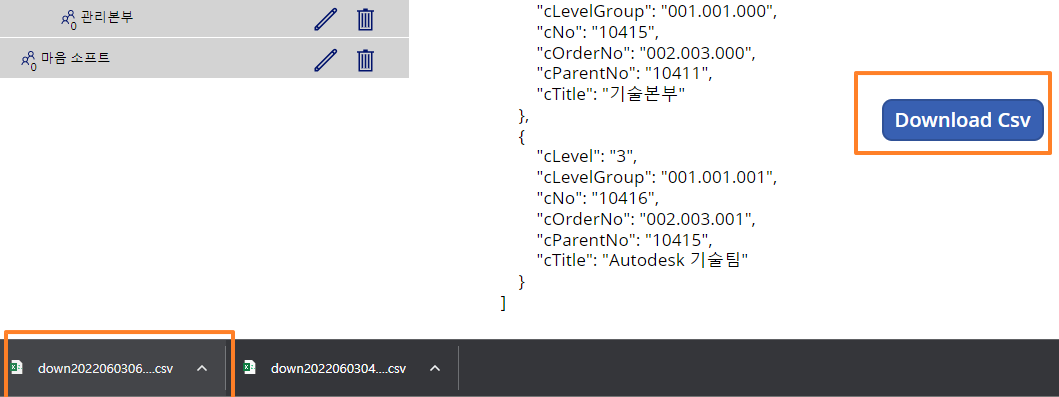Download Csv 버튼을 누르게 되면 아래와 같이 파일이 다운로드 되는 것을 확인 할 수 있음.