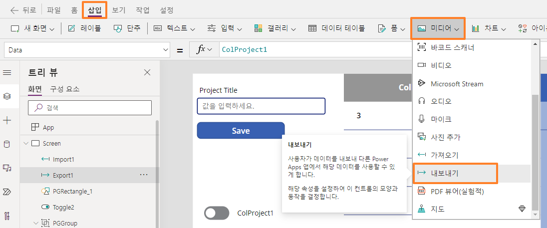 TextInput.Text가 공백이 아니면 해당 값을 ColProject1에 입력 후 TextInput 초기화