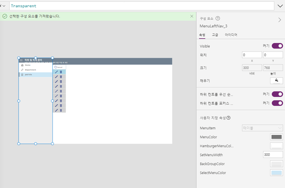 구성요소의 색상 및 MenuItem의 Table 값을 수정하여 원하는 형태로 값을 수정 할 수 있습니다.