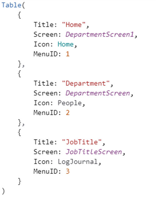 Table({Title:"Home",Screen:DepartmentScreen1,Icon:Home,MenuID:1},{Title:"Department",Screen:DepartmentScreen,Icon:Icon.People,MenuID:2},{Title:"JobTitle",Screen:JobTitleScreen,Icon:Icon.LogJournal,MenuID:3}) |