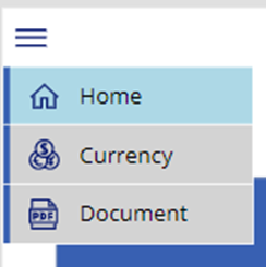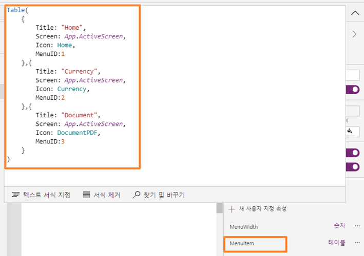 Table({Title:"Home",Screen:App.ActiveScreen,Icon:Home,MenuID:1},{Title:"Currency",Screen:App.ActiveScreen,Icon:Currency,MenuID:2},{Title:"Document",Screen:App.ActiveScreen,Icon:DocumentPDF,MenuID:3}) |
